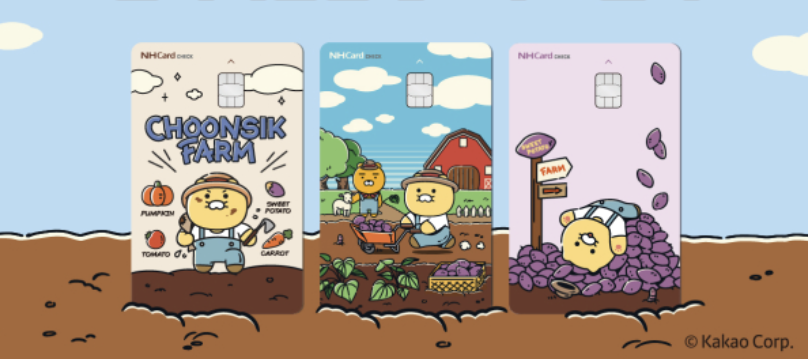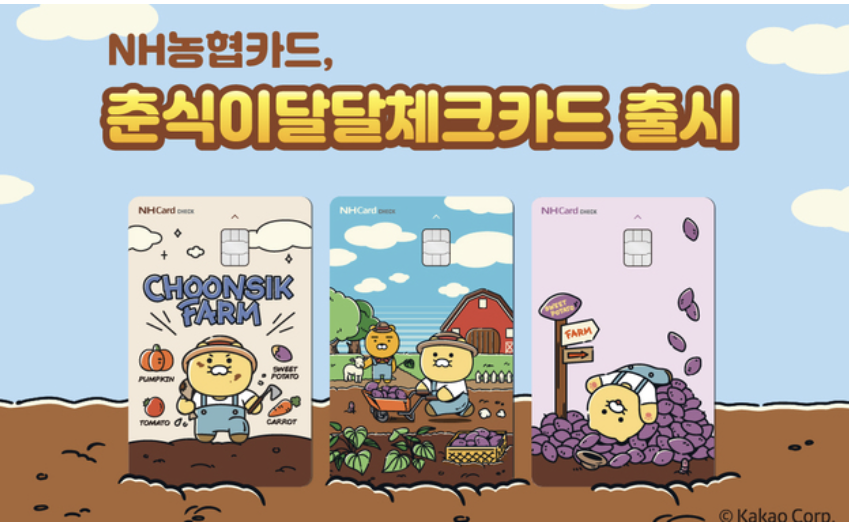 NH농협과 카카오가 함께 만들었습니다. 춘식이달달체크카드는 귀여운 춘식이와 고구마 농부를 그린 것입니다. 세 가지 디자인을 제공해 고객이 좋아하는 것을 선택할 수 있어요.